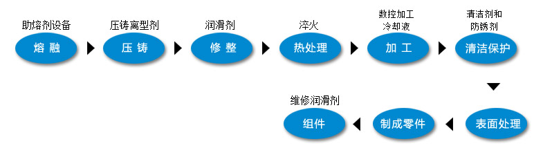 我们在整个产业链中提供大部份的技术:加工冷却液,柱塞冲头润滑剂,压铸离型剂,工艺清洁剂,防锈剂,抗燃液压液